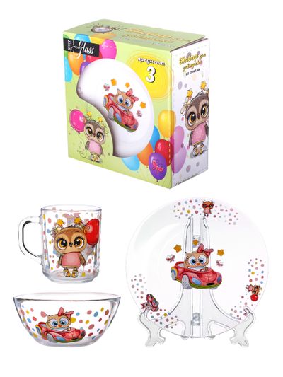 Набор посуды для завтрака состоит из трех предметов (кружка 250 мл, тарелка 19,5 см в диаметре и салатник 13 см в диаметре), каждый из которых имеет красочный декор. Изображение на посуде не боится посудомоечной машины, так как нанесение произведено под воздействием высокой температуры.