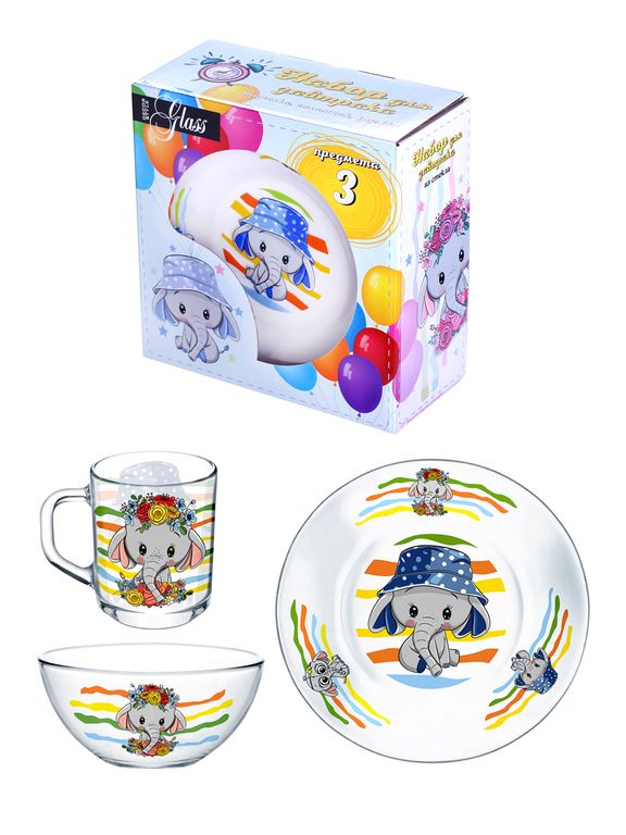 Набор посуды для завтрака состоит из трех предметов (кружка 250 мл, тарелка 19,5 см в диаметре и салатник 13 см в диаметре), каждый из которых имеет красочный декор. Изображение на посуде не боится посудомоечной машины, так как нанесение произведено под воздействием высокой температуры.