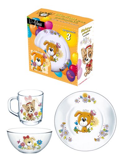Набор посуды для завтрака состоит из трех предметов (кружка 250 мл, тарелка 19,5 см в диаметре и салатник 13 см в диаметре), каждый из которых имеет красочный декор. Изображение на посуде не боится посудомоечной машины, так как нанесение произведено под воздействием высокой температуры.